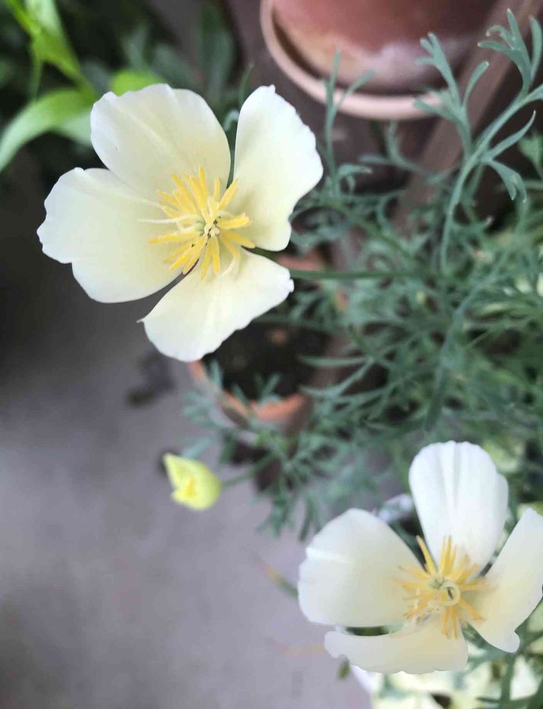 3月に種蒔きした花菱草が、ひょろひょろの姿で咲き始めました。ミックス種からのクリーム色🌼