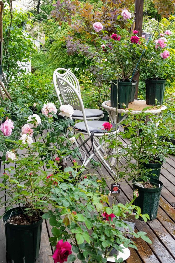 雨が来たので咲いてる鉢薔薇はテラスに避難