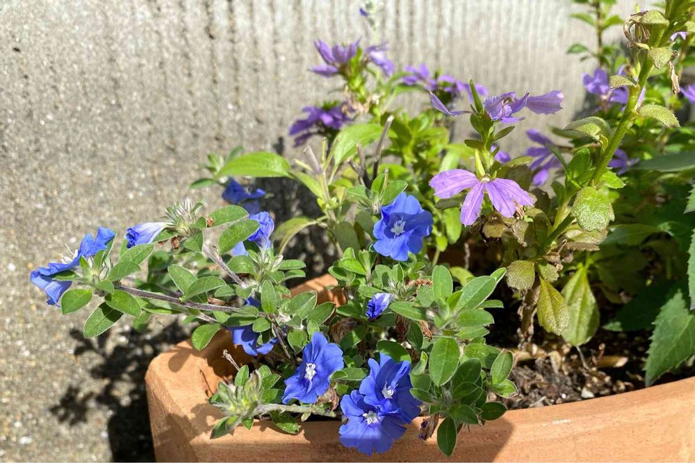 2年目のスカエボラが5月の初めはたくさん咲いていたのに急に元気がなくなって心配していたら 少し復活してきました。アメリカンブルーも咲き出して♡元気が無くなった理原因は🐜さんが鉢の中に素を作ってたからだった??