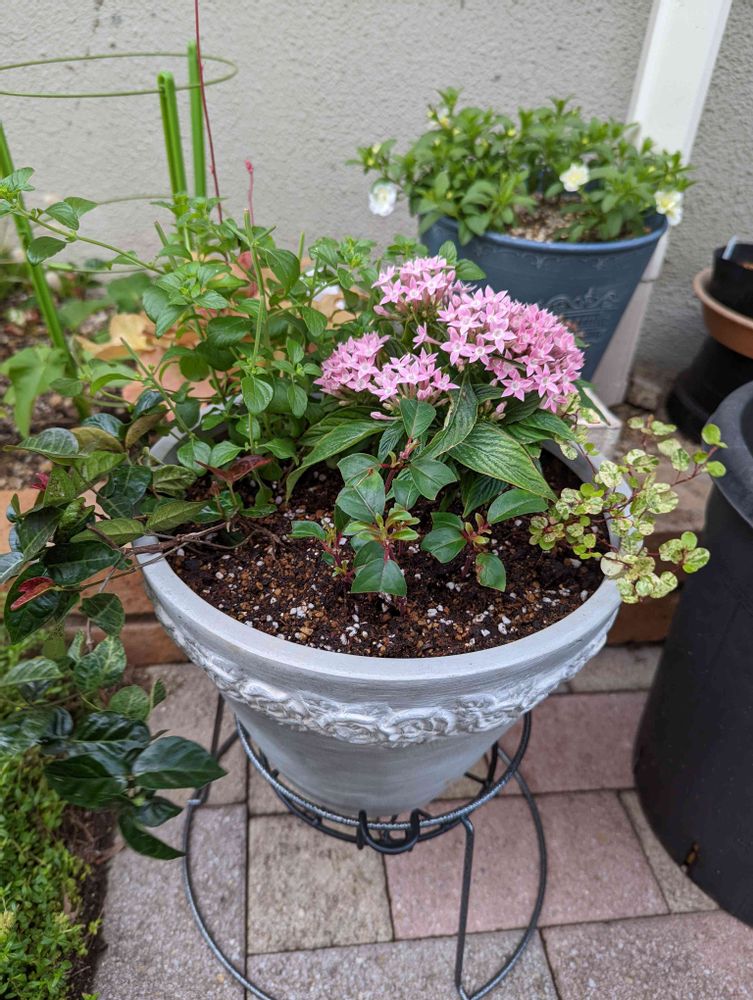 買ってきたペンタスと、うちで挿木した苗で夏の寄植え。