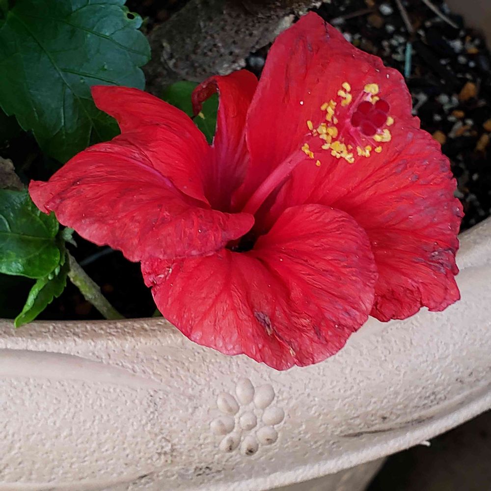 選定しすぎたらしく、鉢の淵ギリギリに顔を出して咲くハイビスカス🌺