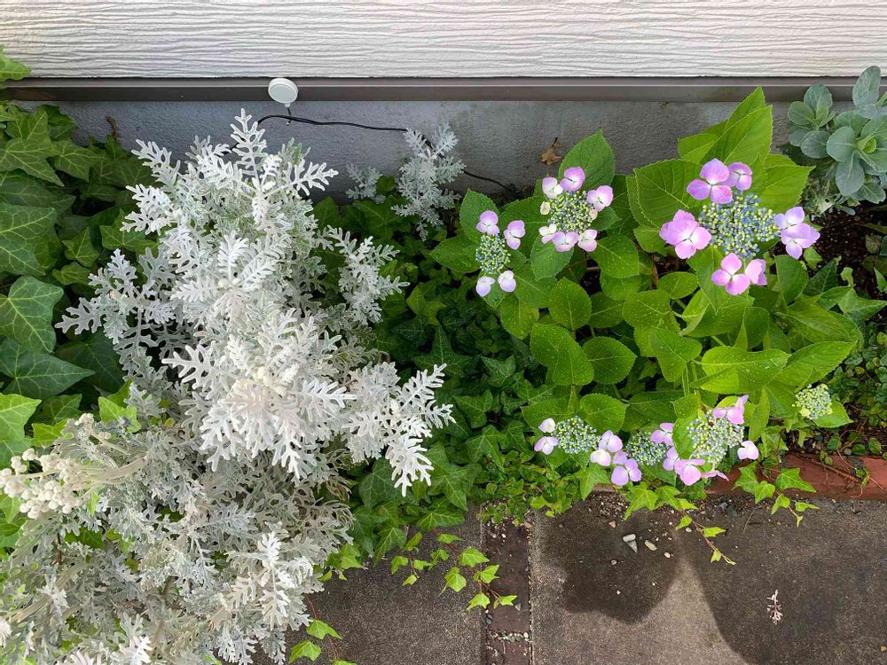 全く陽の当たらない北側の軒下。紫陽花とシロタエギク