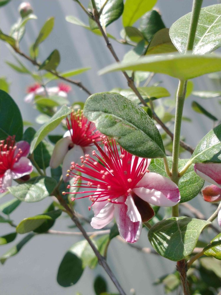 フェイジョア(フトモモ科)真っ赤なシベが 👀見て、みて〜