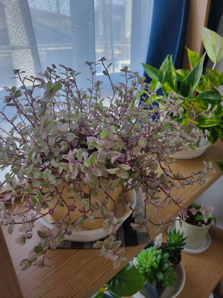 年中室内の南側レースカーテン越しです😊なよなよしたこの感じ!好きなんですけどね~タグを拝見してみたら、家のは徒長しちゃってる💦日照不足と肥料不足かもね😅
