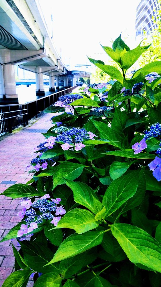 ガクアジサイと阪神高速と堂島川