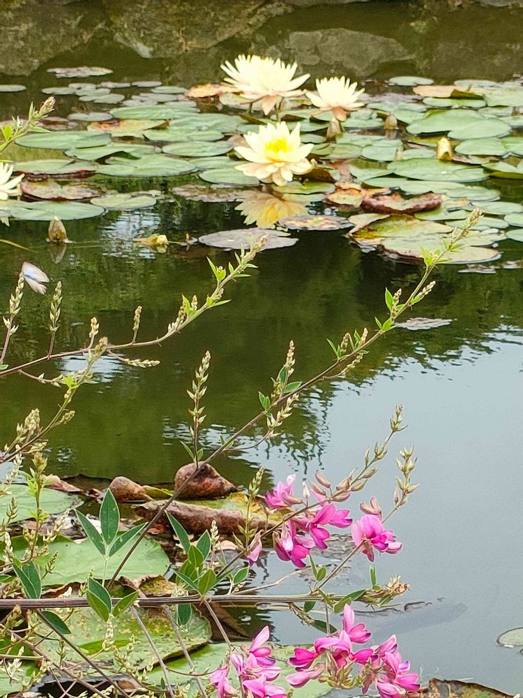 栗林公園の池のほとりで 季節はずれの萩の花が咲いていました なぜ🤔