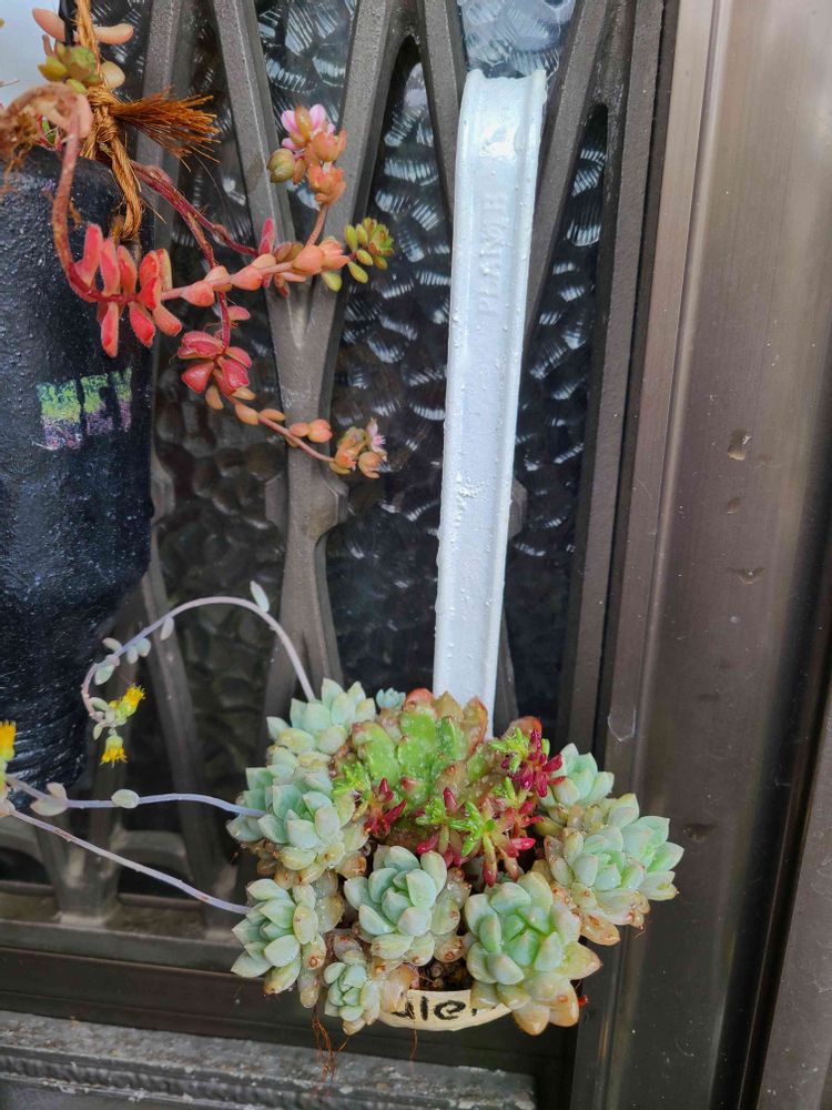 100均のレードルをリメイクして去年寄せ植えピンクルルビー、ピンキー、プロリフィカ