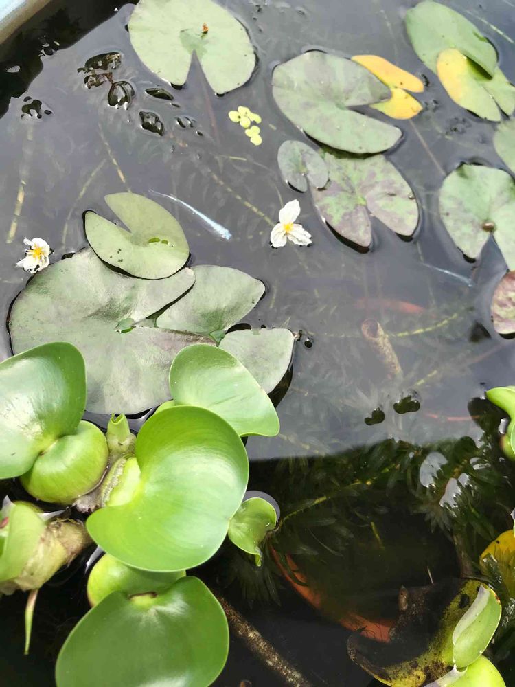 メダカを飼っている睡蓮鉢の水草アナカリスに小さな白い花が咲いていました。かわいい。