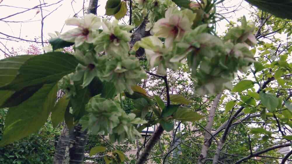 葉桜に混じってひっそりと咲いている、黄緑色の桜