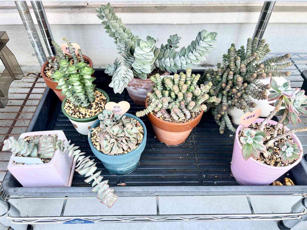 一番下の段で陽に当たる時間が短いので、ガンガン日光が苦手なクラッスラっぽいものを集めて置いてます🌵
