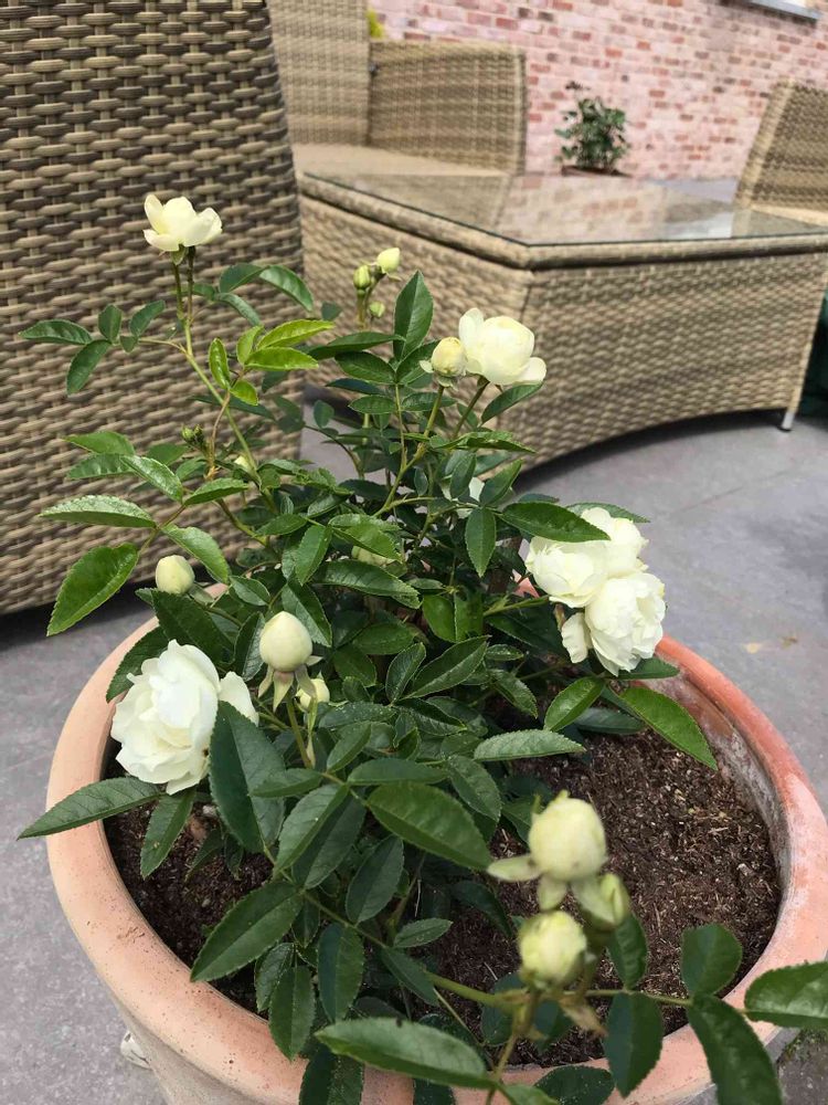皆さんの投稿を見て、ホワイト・マザーズ・デーと言う事が分かりました。☺️地植えしてたんですが、両側の薔薇達🌹に押されキツくなったので鉢植えに🪴。ご覧の通り小ちゃくなりました。でも健気に可愛い花を咲かせてくれて🥰