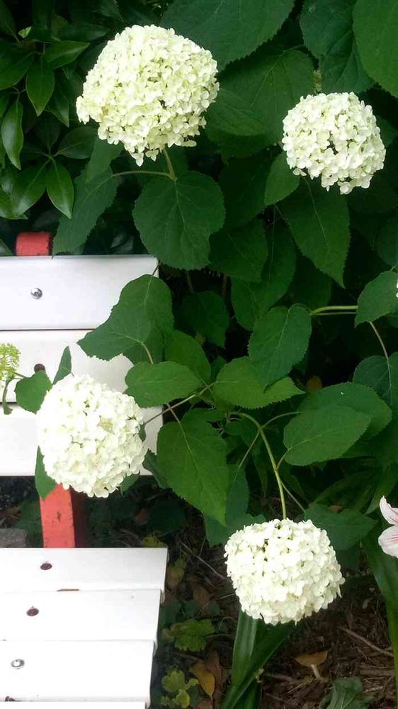 白いベンチに白いアナベルさん、オッシャレ〜😍✨