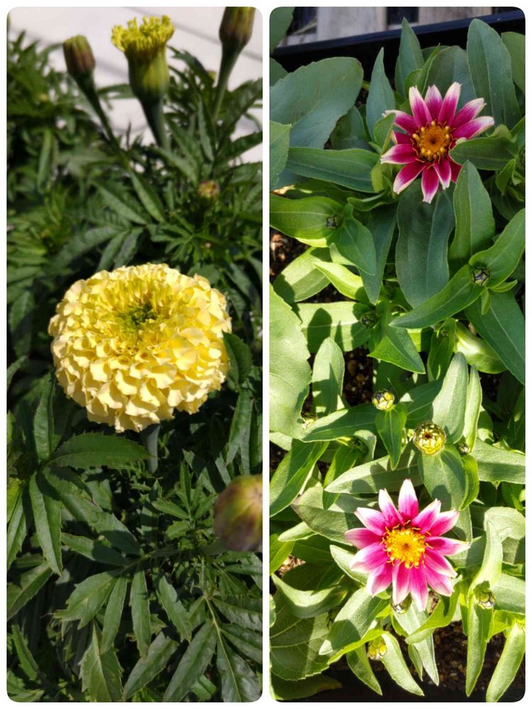 種まきマリーゴールドバニラとジニアチェリーバイカラーがやっと咲いてくれました🤗