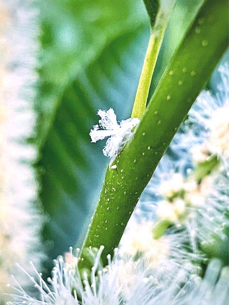 小さな花かと思いきや、脚のある青羽羽衣の幼虫のようです。