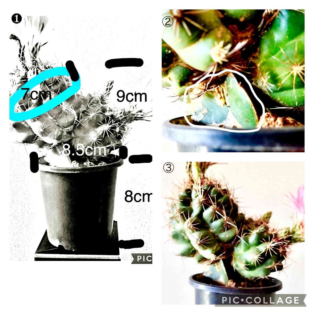 ギムノカリキウム属・❶それぞれの寸法②三角柱サボテンを台木に、接木、白で囲んだ部分、③全景☘️三角柱サボテンに接木のため、冬場は室内で管理。