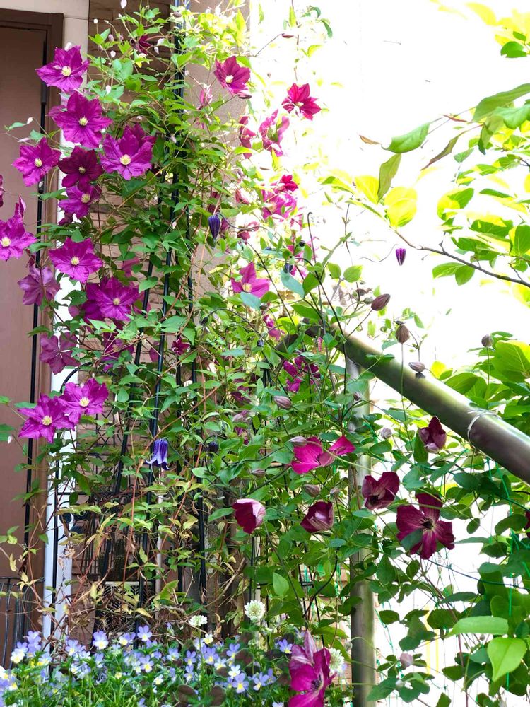 鉢植えクレマチスは、毎年違うところにいろんなふうに誘引して楽しめるので大好きなんです😘