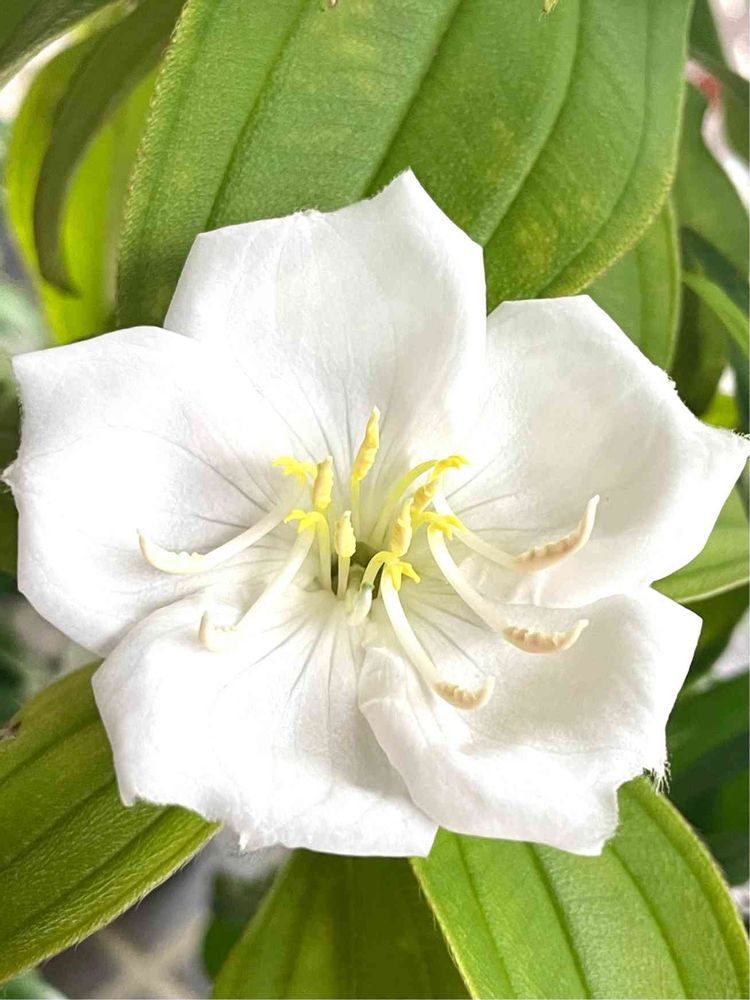 紫のノボタンの葉は艶がありますが、このシロバナノボタンの葉はマットな感じ。