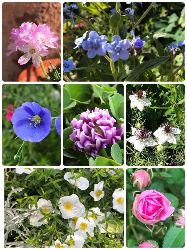 ブルーのお花は、宿根アマです。🏷には白ってあったのに、咲いたらブルーです。白の方が珍しいと思ったのにね。