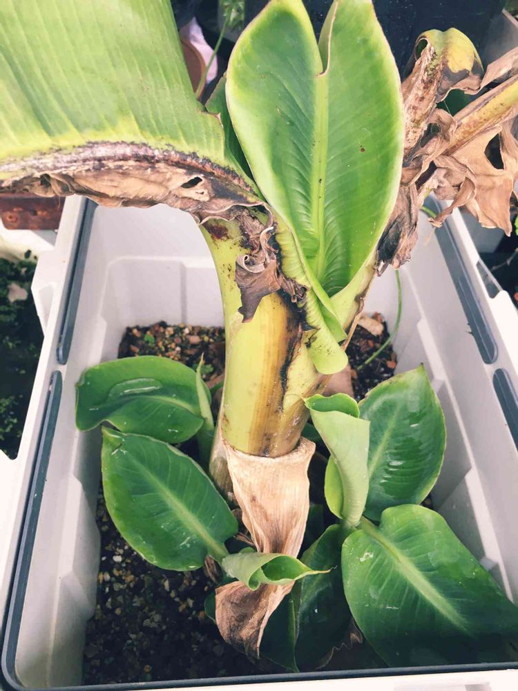 バナナ。去年の苗を冬越しさせたのですが、調子がよくありません。成長が止まっているようです😭が、しかし周りから子株が3つも!しかも子株はどんどん成長しています。もしかしたらそっちに栄養を持っていかれちゃってるんでしょうかね。