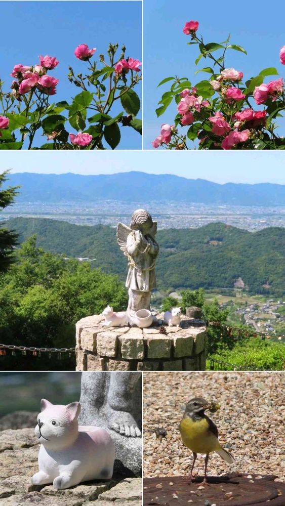 標高400m地点のツルバラ(上)に囲まれた天使像のある展望台からは、吉野川の北岸と南岸一帯が一望でき素晴らしい眺めでした(中)。