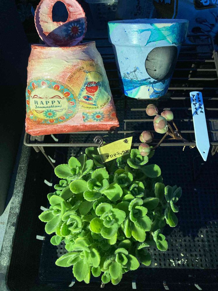欲しかったアロマティカスは、最高に良い匂いだし、珍しいアエオニウムだし、かっこかわいいリメ缶・リメ鉢はゲットできるしで、とてもホクホクです!参加させてもらい、ありがとうございました😊