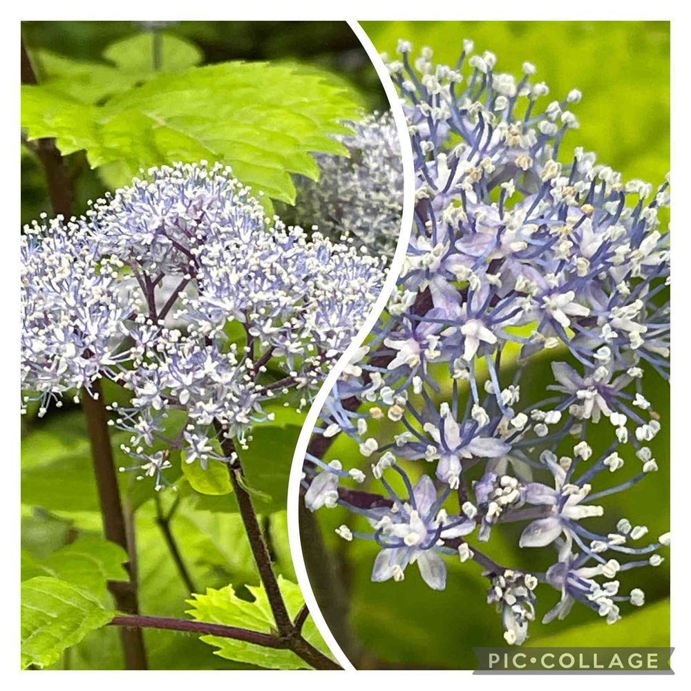 「コアジサイ」小さな薄いブルーの花が咲いていました。前回つぼみだけで、花を見ることができなかったので、うれしい。