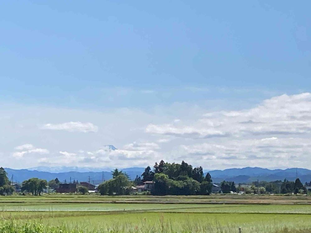 昨日の田園風景‥雲の間に鳥海山🗻の頂上だけ観えます。