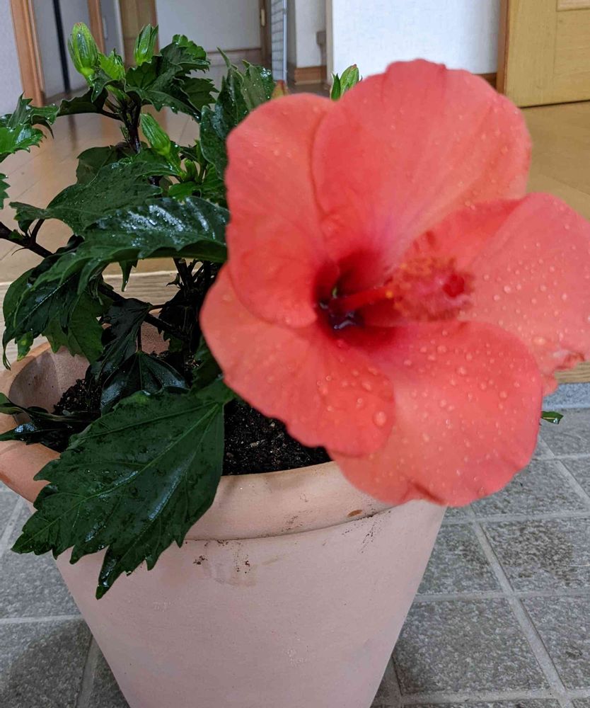 今朝、昨日まで蕾だったハイビスカス🌺が一輪だけ咲いていて風に煽られ落ちそうになっていたので家の中に入れました