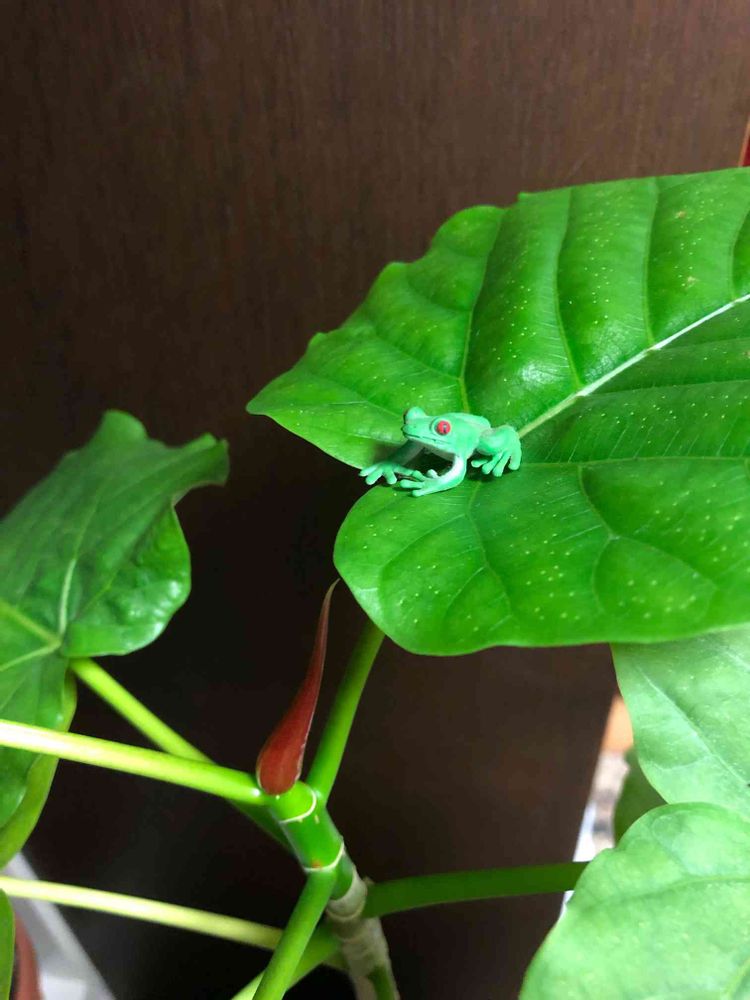 ウンベラータの芽の色と🐸さんの目の色がにてる