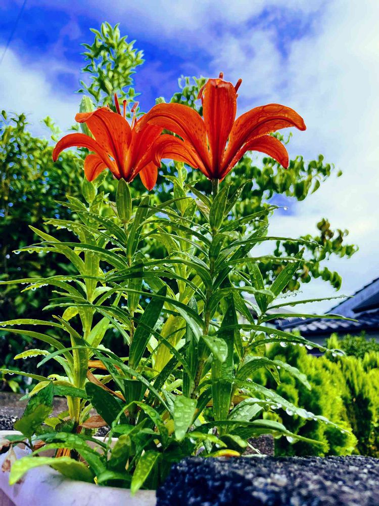 昨日出勤途中で、通り道の塀の上に、☔️上がりでキラキラしているスカシユリを見つけました。