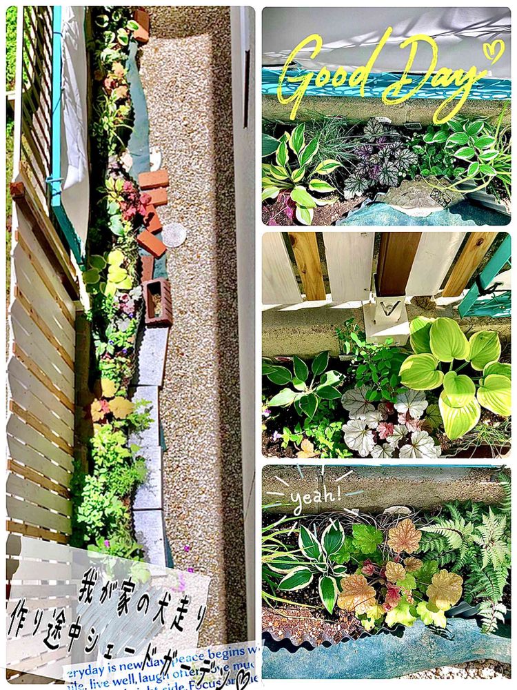 犬走りの狭い裏庭に、少しずつシェードガーデン作り中 土留のレンガをモルタルで固めて花壇作ろうと考え中ですが💦なかなかすすみません😂