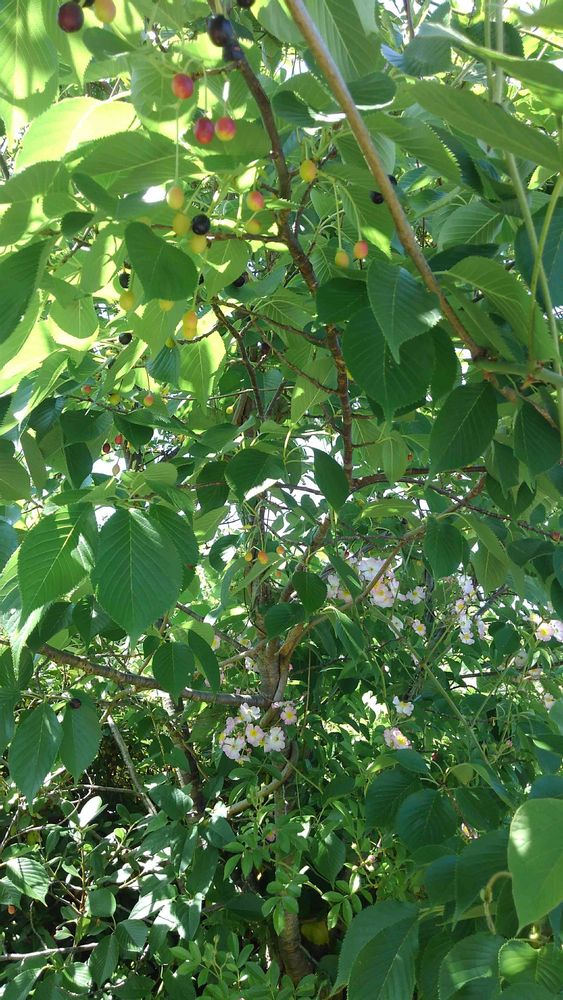 画像は、桜の木に実った小さいさくらんぼとピンク色のノイバラです🌸