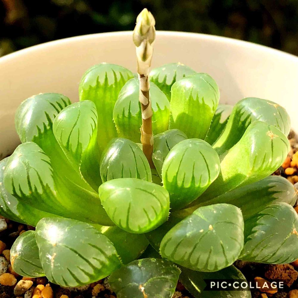 ハオルチアオブツーサ(オブちゃん)です。和名で雫石(しずくいし)と言い、丸い葉っぱに透明感のある「窓」が特徴です。真ん中にあるのは花芽です。家族に危うく「楊枝ささってるよ。」と抜かれるところでした😱💦白と緑のストライプの蕾から百合の形をした🌸を咲かせます。