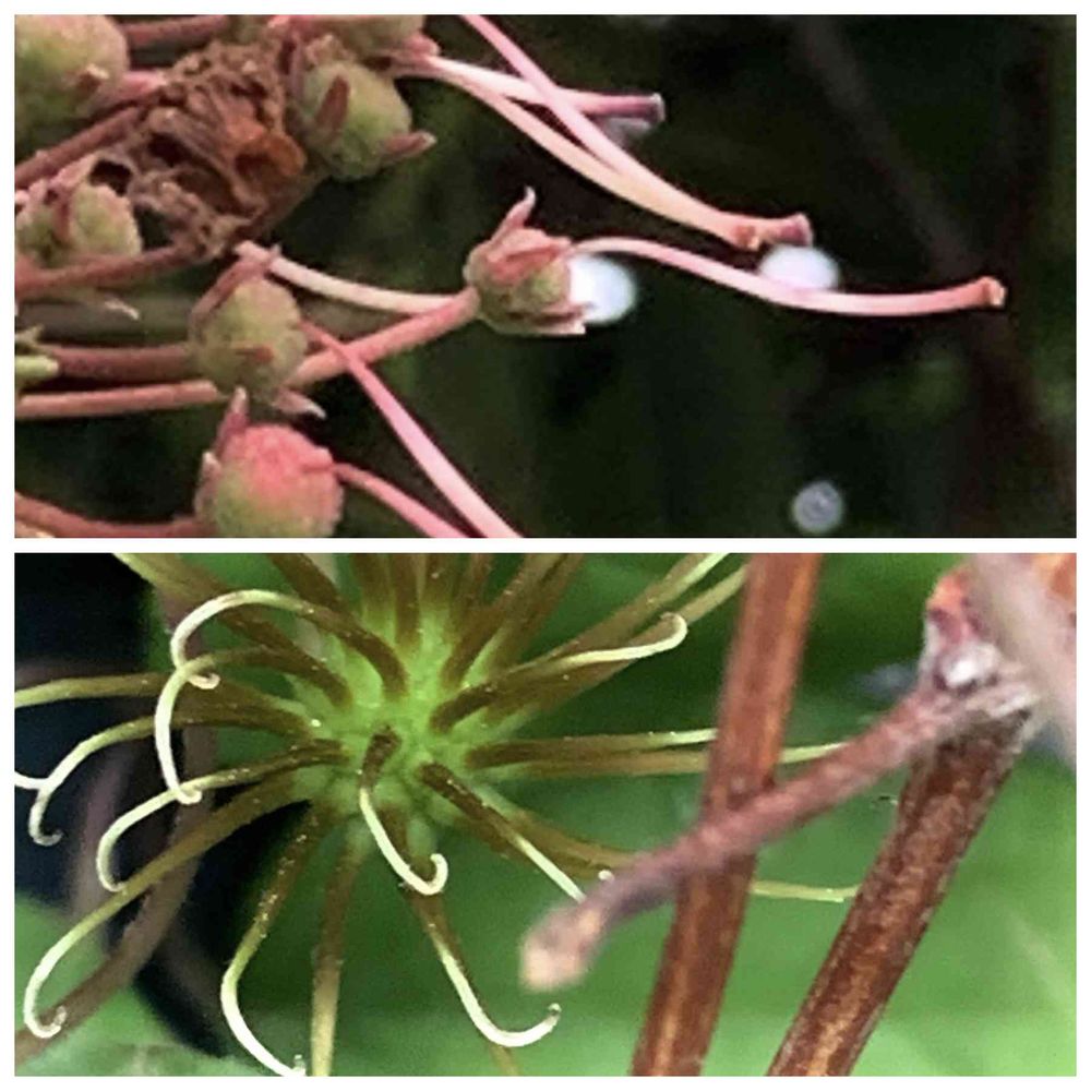 カルミアもクレマチスも・・・、どこに向かって蕊を伸ばす🤔