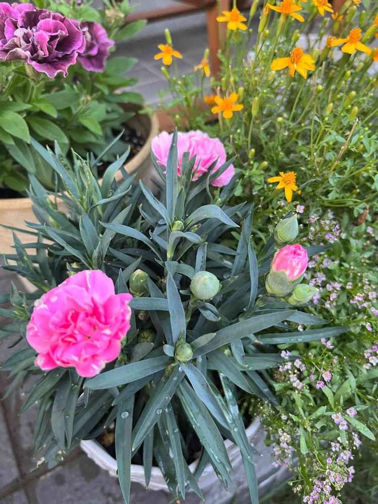 カーネーション、買ってきた後、花がどんどんダメになって一旦切り戻して、植え替えてみたら、また蕾つけてくれてる🤣