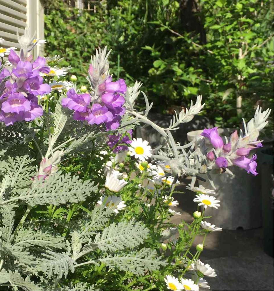 葉牡丹とパンジーさんが寄せ植え鉢の主役でしたが エレモフィラさんの薄紫のお花に変わりました💕