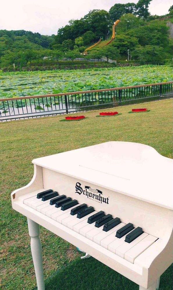 緑の中に白いピアノがポツンとあると、まるでアートのようですね♪素敵💕😄