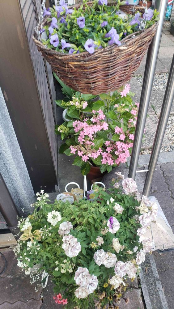 吊るしのバスケット、夏は、トレニア。あじさい、根詰まりしてるかもー?葉の色が、よくないよー