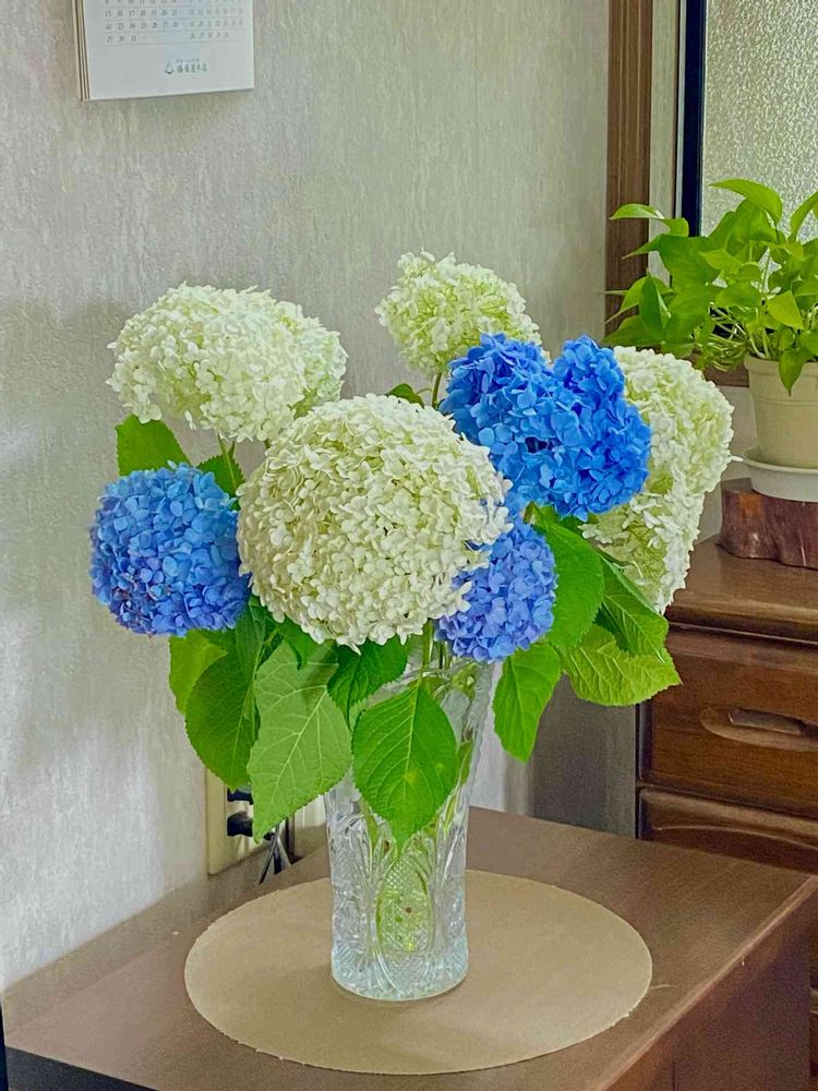 今朝は、白いアナベルと青い紫陽花を切って居間に置きました。曇り空で、部屋の中も暗くなりがちですが、少し明るくしてくれます🧚♀️
