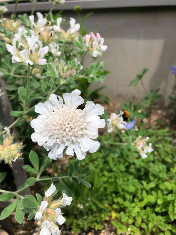 ロータス・ブリムストーンの花にまぎれてスカビオサ アメジストスノーが咲いていました。昨年ここに移植して小さくなりましたが、ひっそりと咲いてくれました〜。