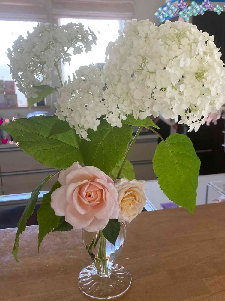 今朝 お庭でアナベル✨とピエール・エルメ🌹を摘み花瓶へ♡