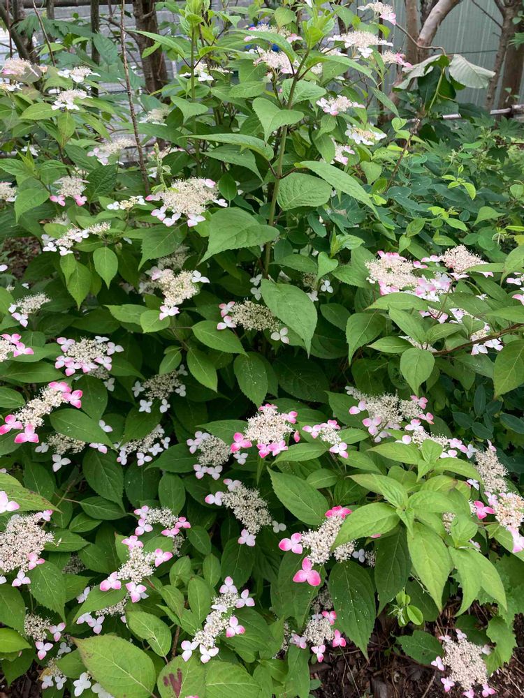 ヤマアジサイ 紅(クレナイ)です。本来は濃い紅色ですが、発色をしてくれないのは日照不足が考えられるようです。