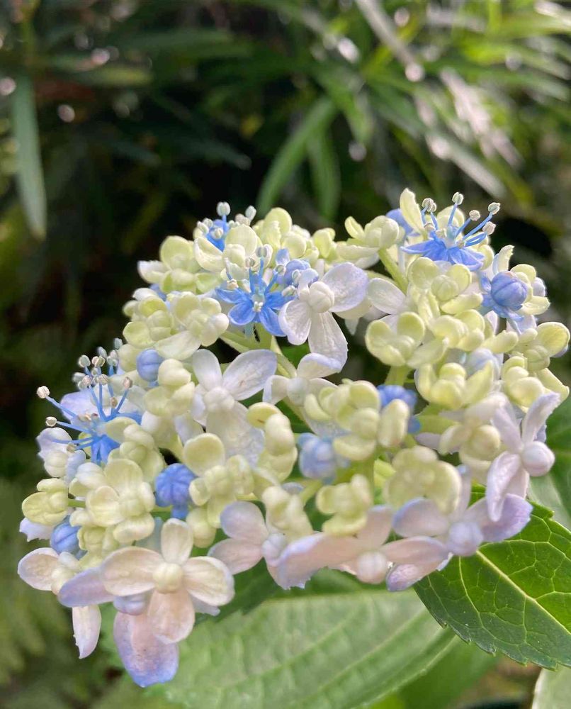 この繊細そうな紫陽花 三河千鳥 は、装飾花(めしべが退化しているので完全なお花じゃない)がなくて、両性花(おしべとめしべが揃ったいわゆる本当のお花)しかないという、紫陽花の世界では珍しいタイプのお花😆