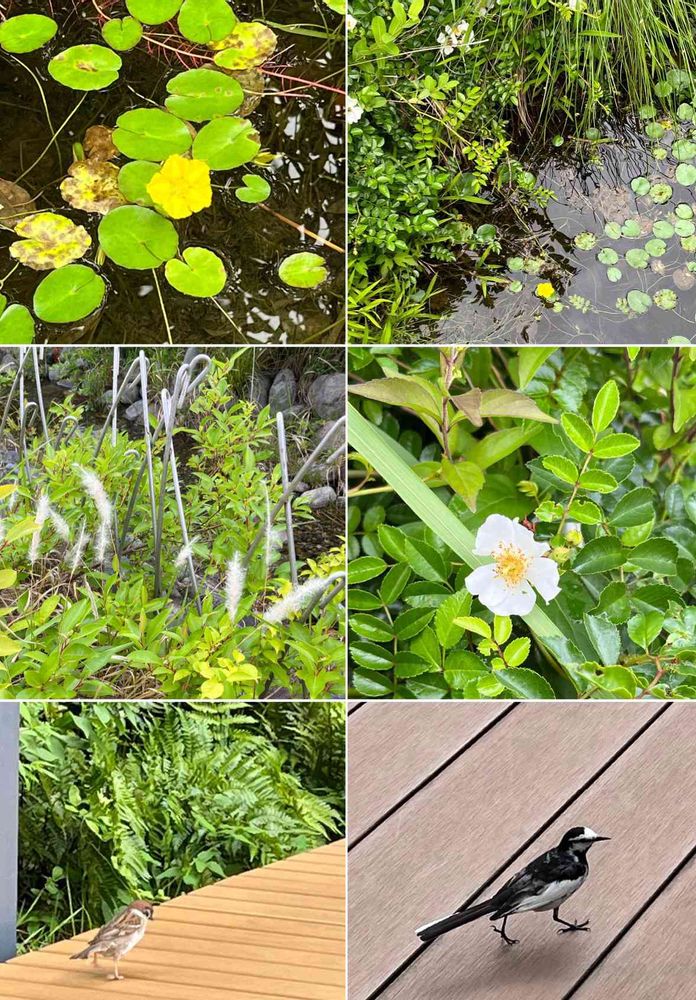 これ以上は近づけませんでしたが池に切れ込みの入った浮草と黄色い花