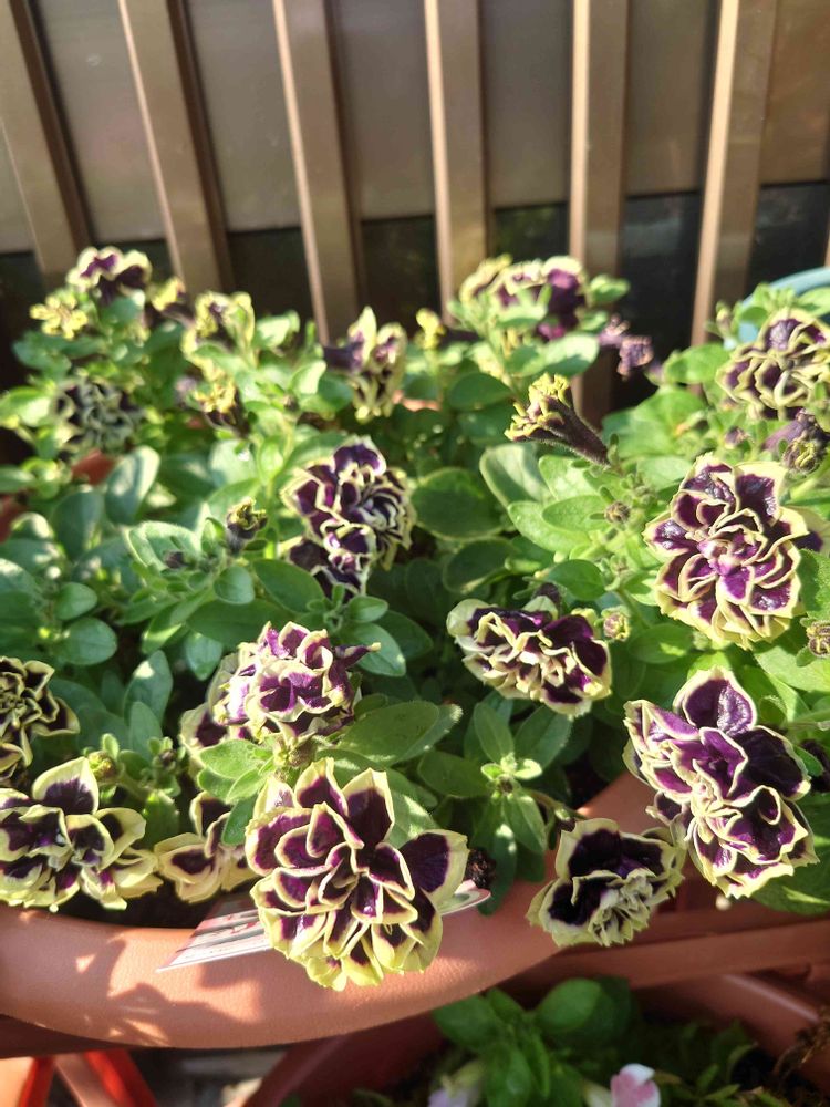 シックな色合いの八重咲きペチュニア、ステキですね〜 まもなく溢れるように咲きますよ‼️