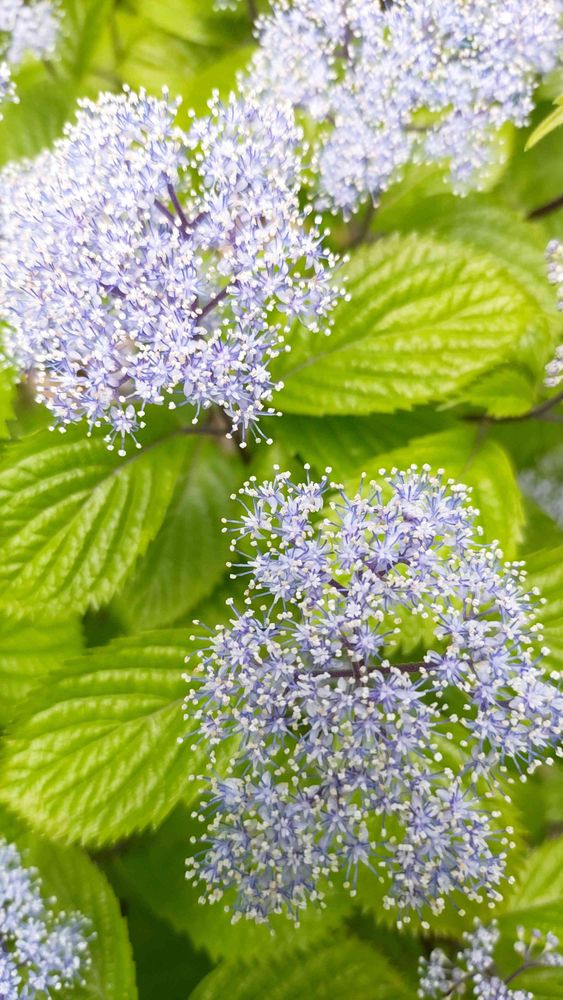 枝先に径5cmほどの複散房状の花序を出し、径4mmほどの両性花のみをつけます。 両性花は青色の5弁花で、雄しべは10本で青色です。