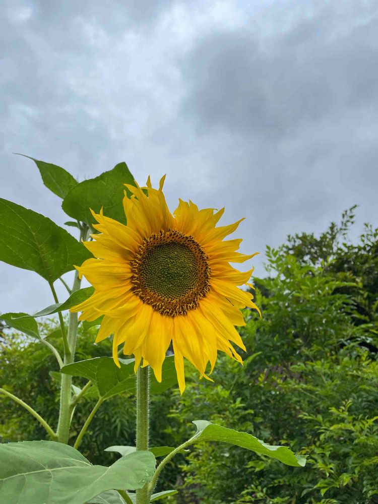 どんよりしてますが、我が家のひまわり🌻咲きました🌻去年の溢れ種から開花です♪♪