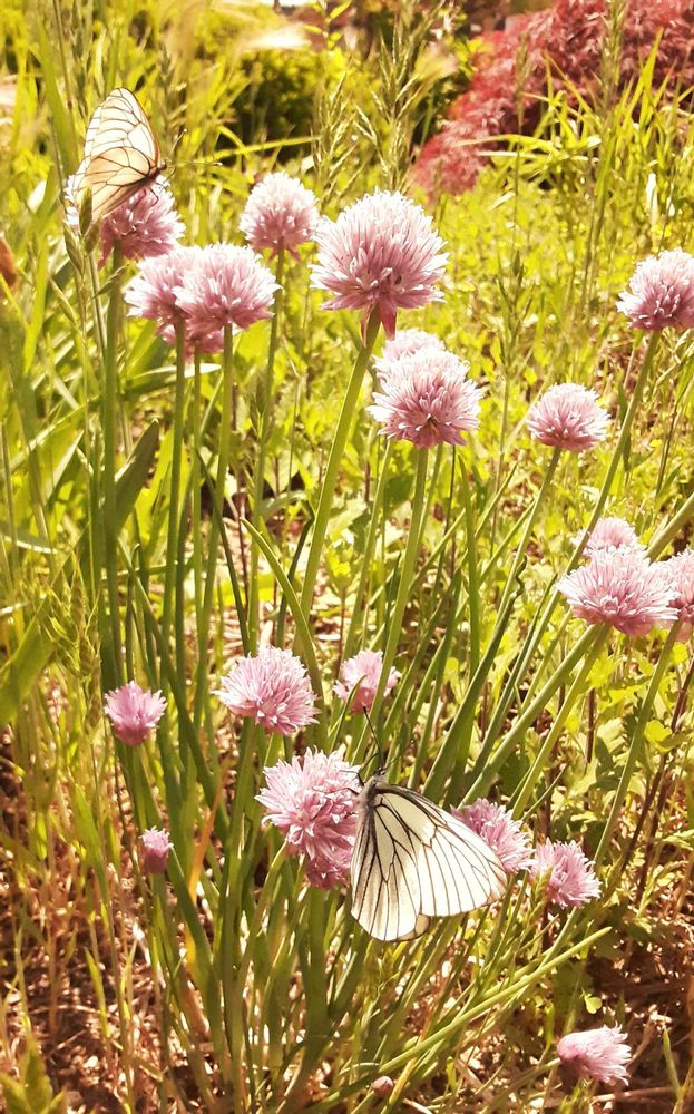 庭のチャイブの花に蝶が2匹、蜜を吸いにやって来ています。どうやらチャイブの花の蜜は虫たちの好物らしいです。