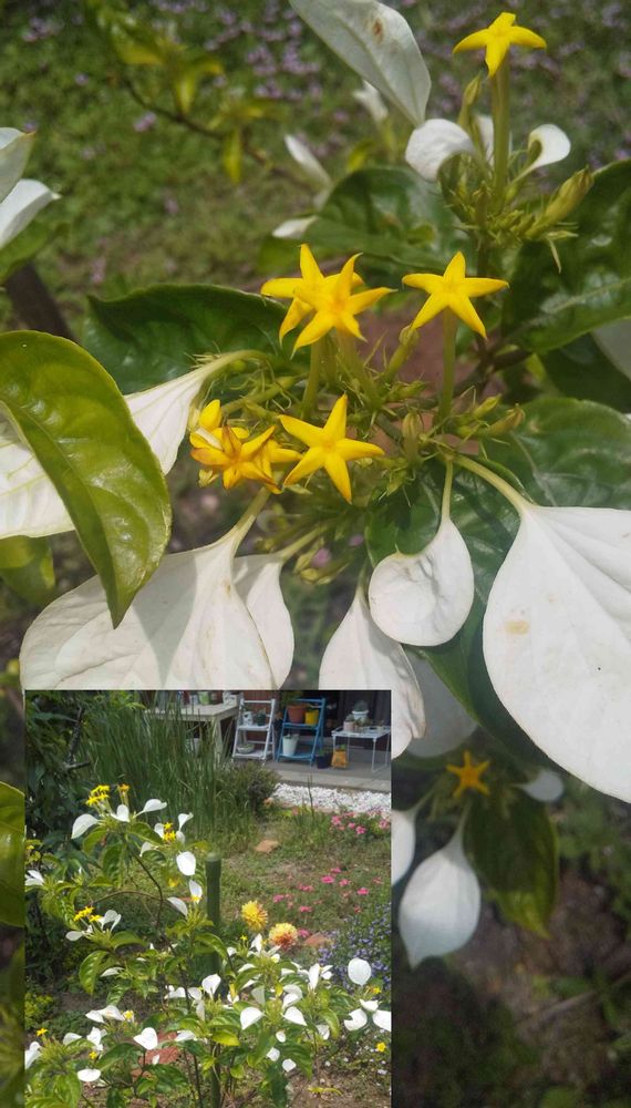 ミドリ🟩いっぱいの庭に、黄色💛の花と純白の葉🙄?(又は、萼)。