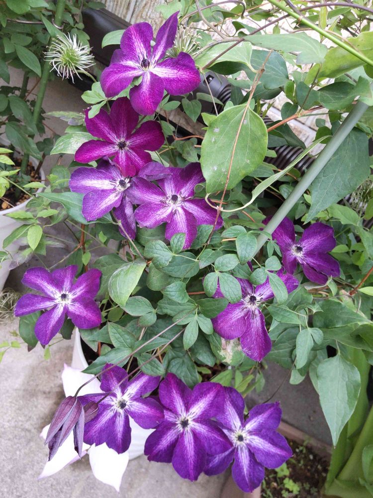 *6組ワンセットのクレマチス💮3色目の紫花が咲いています。咲き始めはベビーフェイス🐣💜(左、上から2輪目)が、段々と白がハッキリと出て小ぶりながら花数も多く、お楽しみセットは程々に満足モードです♡♡♡
